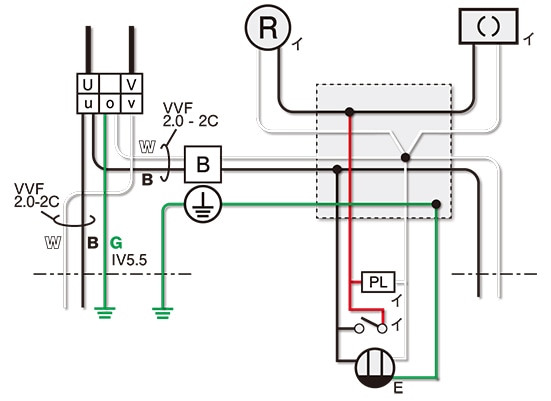 • ⑤配線用遮断器から繋がる二次側100V回路の複線図を描いていきます。