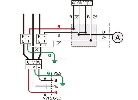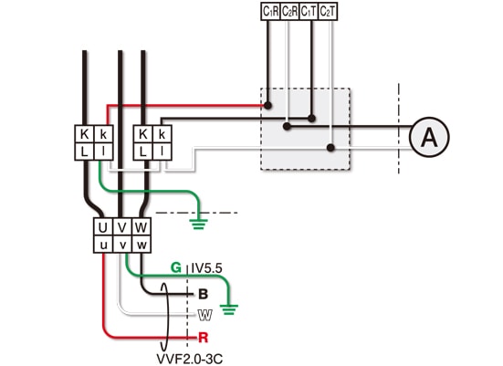 ・CTの二次側からジョイントボックスに至る配線はR相:赤色、T相:黒色を使用する
