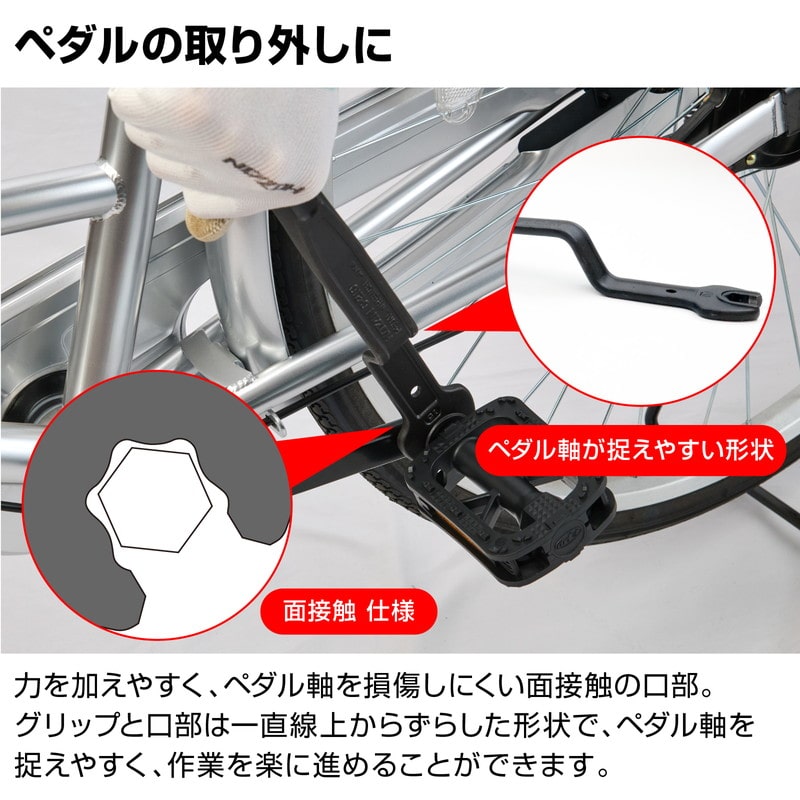 六角形のペダル軸に対して面で接触することで耐久性を高めたペダルレンチ。