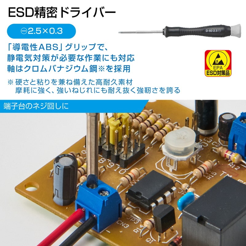 グリップとキャップに導電性ABSを採用しているため、静電気対策が必要な作業にも対応できます。