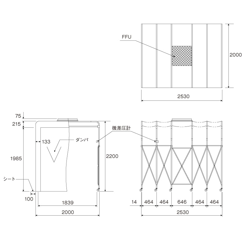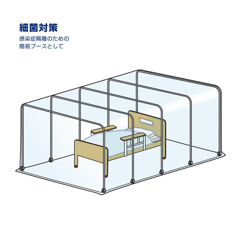 陰圧ブースは最も縮めた状態で幅2000mm×奥行き850mm(ベッド一台分程度)になり、最も展開した状態で幅2000mm×奥行き2530mmになります。