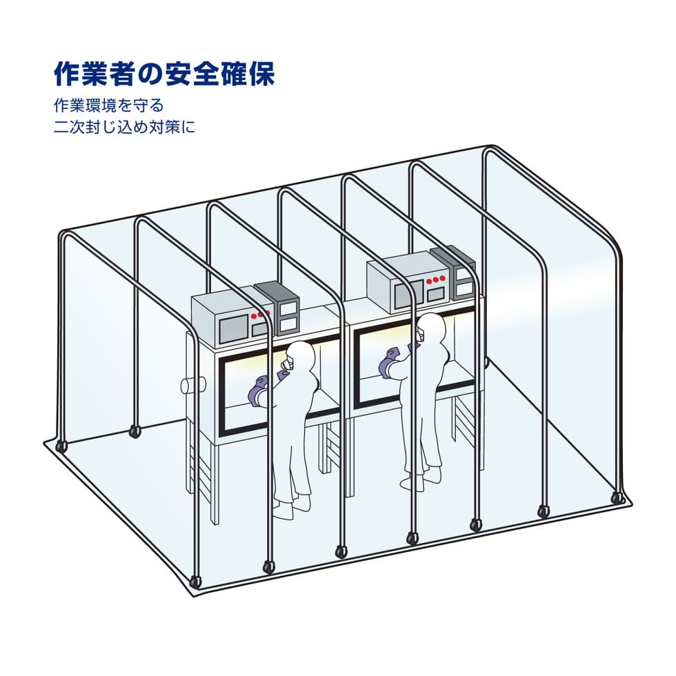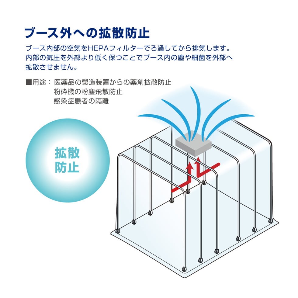 天井に搭載した高性能HEPAフィルター付きのファンフィルターユニットで排気を清浄化し、ブース内を陰圧に保つことでマイクロミスト(エアロゾル)などの拡散を防止します。