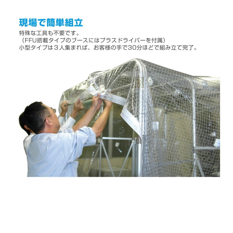 高性能のHEPAフィルターとプレフィルターで構成されたファンフィルターユニットは一般的な100Vコンセントで動作し、電源をONにした後、わずか数秒でブース内が陰圧状態になります。