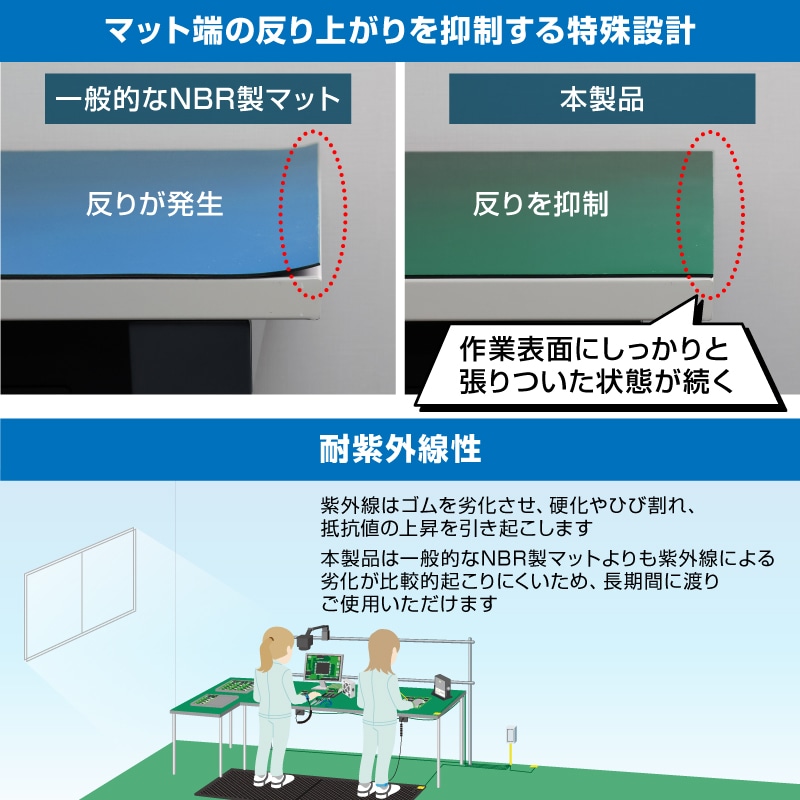特殊設計によりマット端の反り上がりを抑制することで、安定した敷設状態を維持。