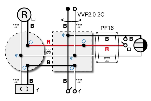 1.接地側はコンセントと負荷(電灯など)につなぐ → 白線