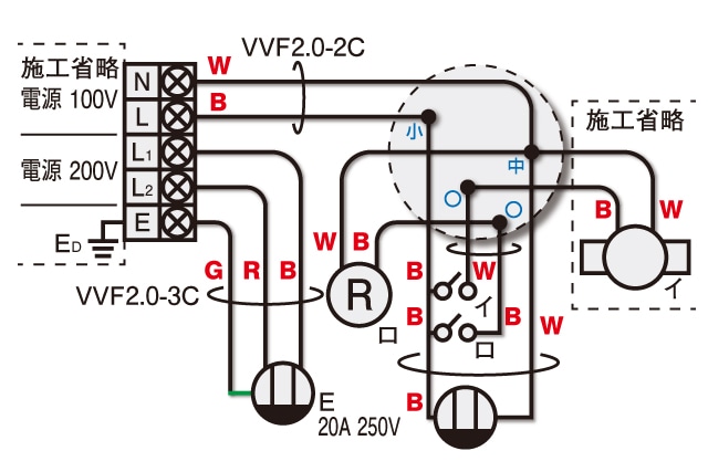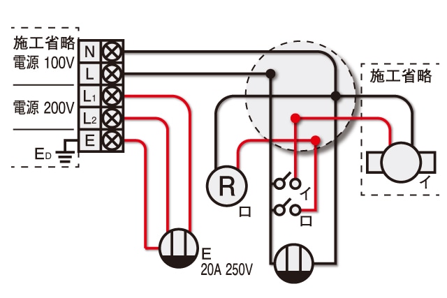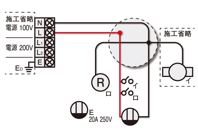 単相200Vの電源端子には極性がないため、白線以外の黒線もしくは赤線を用います。